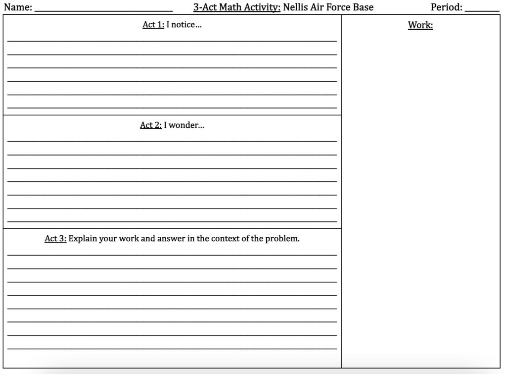 Nellis Air Force Base 3-Act Math Posted byquinnekendallOctober 27, 2024November 17, 2024Posted inQuinn Kendall’s Las Vegas 3-Act Math https://docs.google.com/presentation/d/1e2OAwEmCI14QqQ80qZuR4J-VEDx8Ip129ezemanlJOc/edit?usp=sharing Share this: Click to share on X (Opens in new window) X Click to share on Facebook (Opens in new window) Facebook Like Loading...